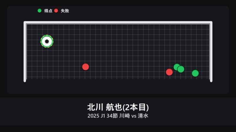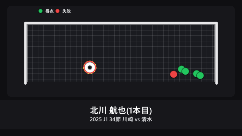 キッカーは北川航也だが、これを止められてしまう・・・。