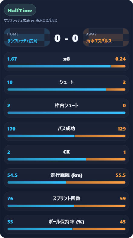清水もロングスロー攻勢に出たりするが、やはり前半は広島のゲームだった。