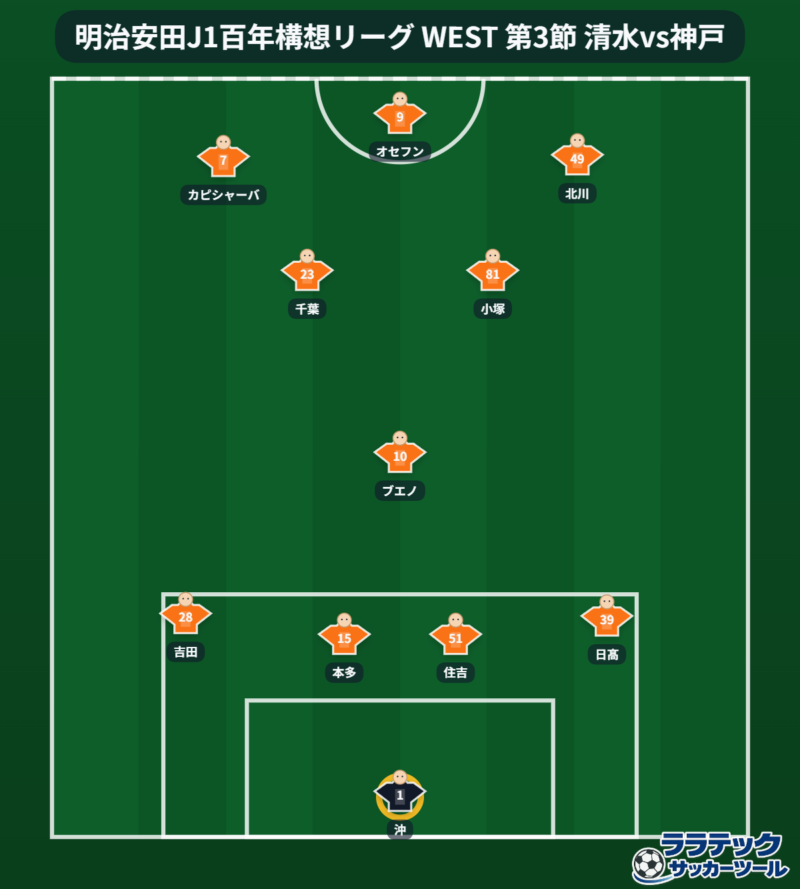 数的優位の清水だったが、ただ神戸はしっかりブロックを敷きながらで、中々清水は活かせずにシュートまでいけない。