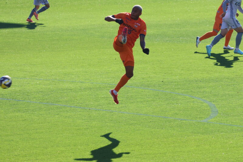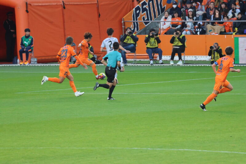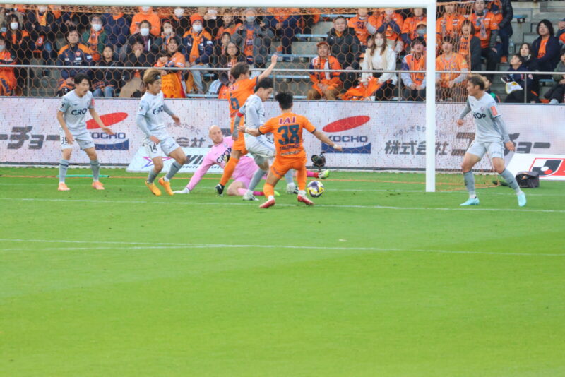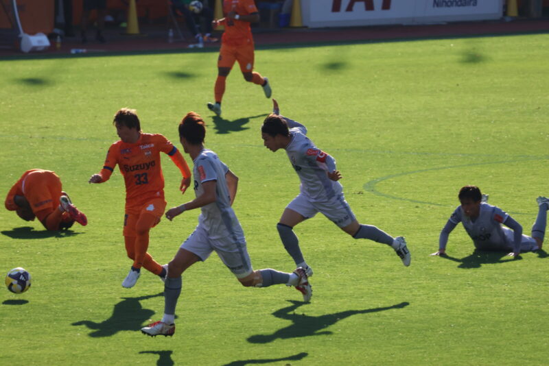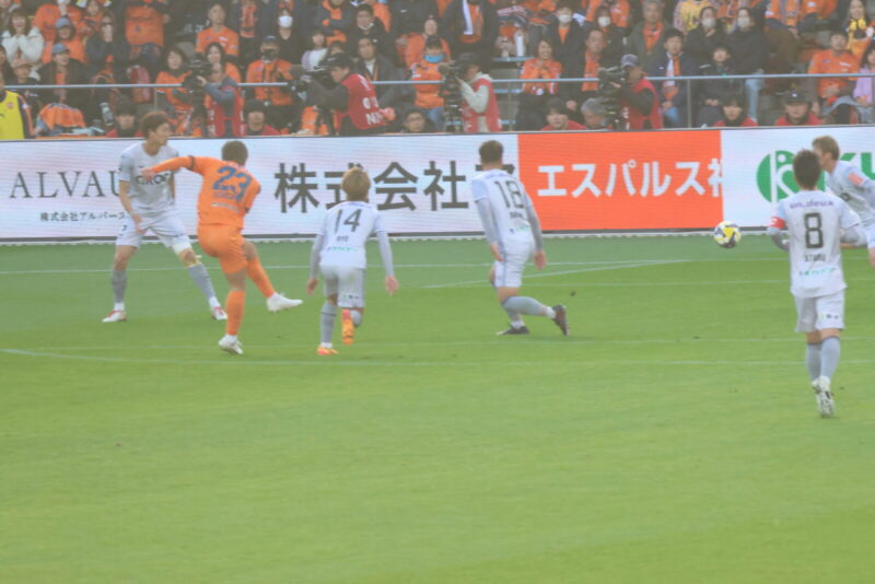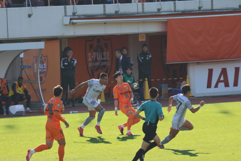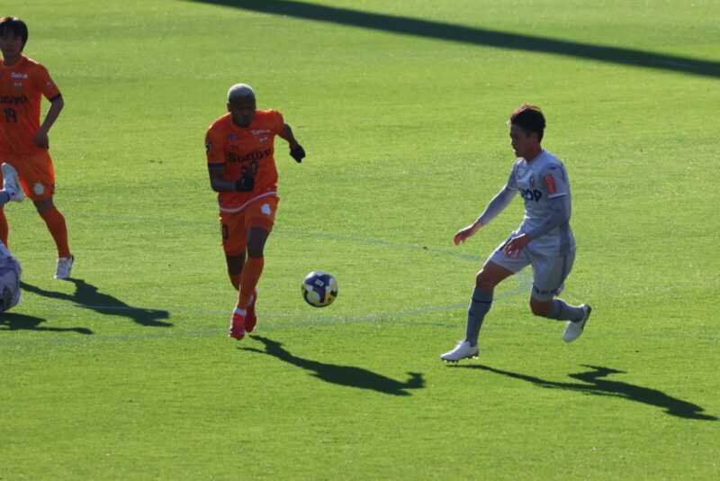 追いつきたいエスパルスは再開直後、乾がコントロールシュートを狙うけど防がれる。