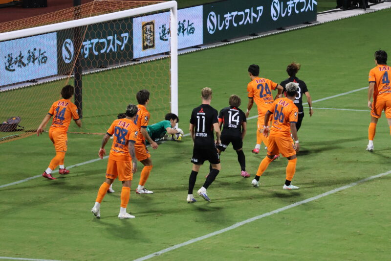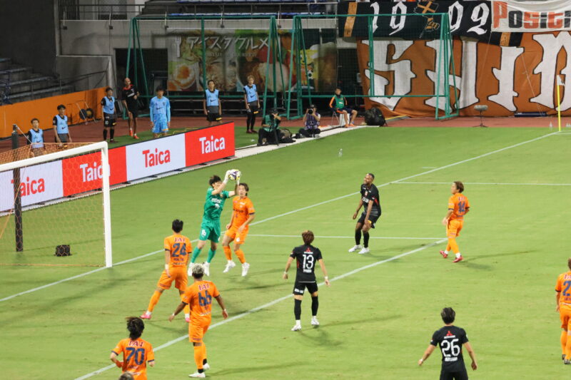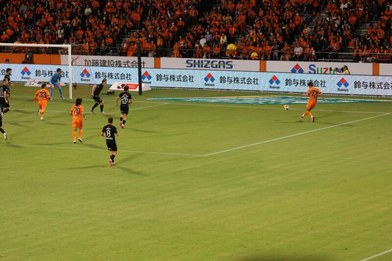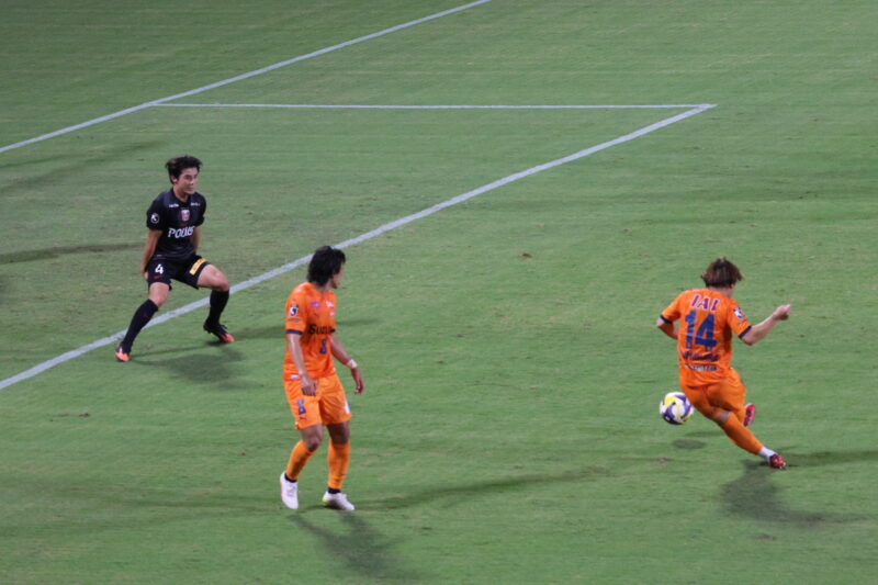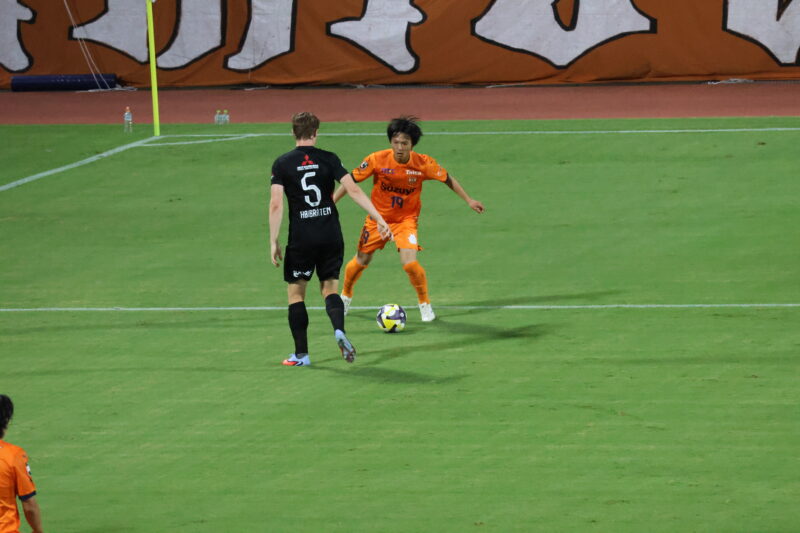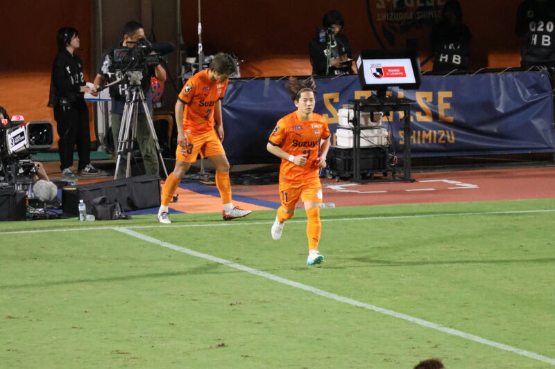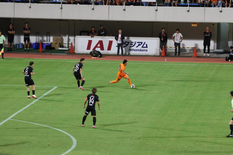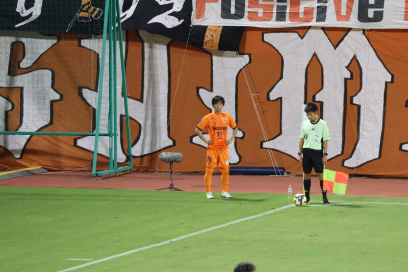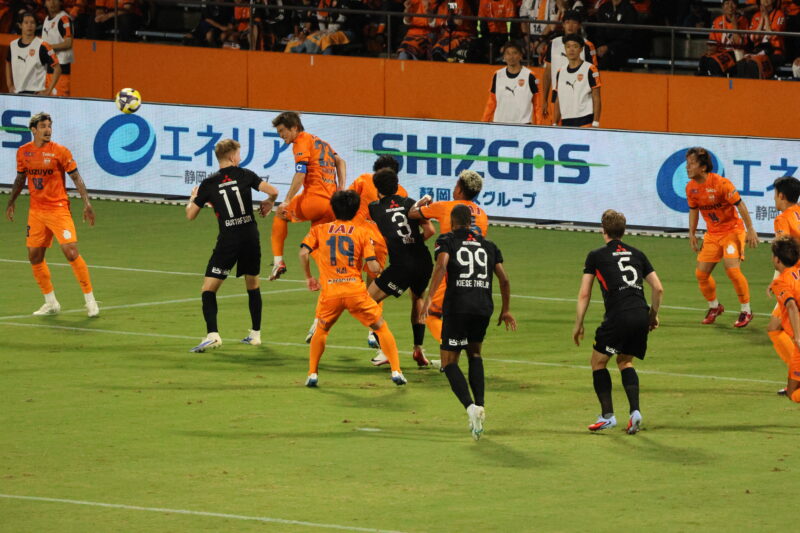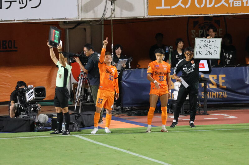 清水は序盤、左サイドからのアタックでCKを獲得したり、右は快速の北爪を活かしながら、裏を狙って攻めていく。
