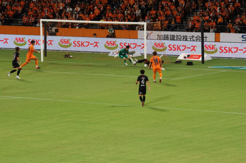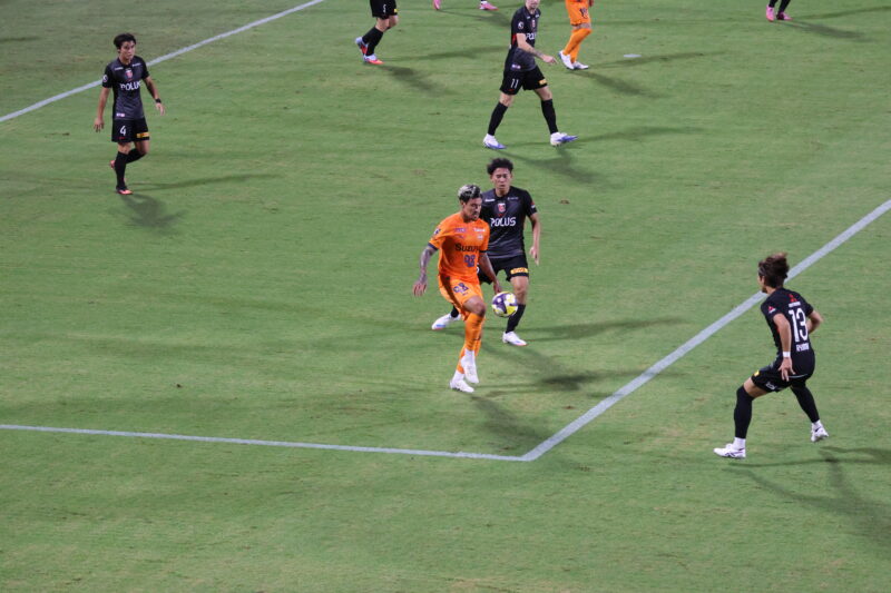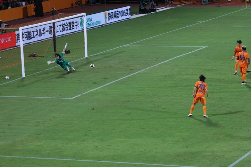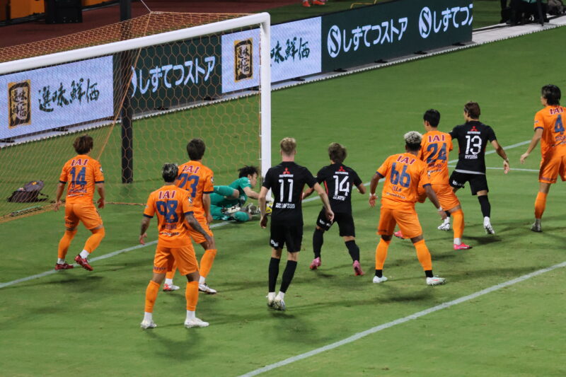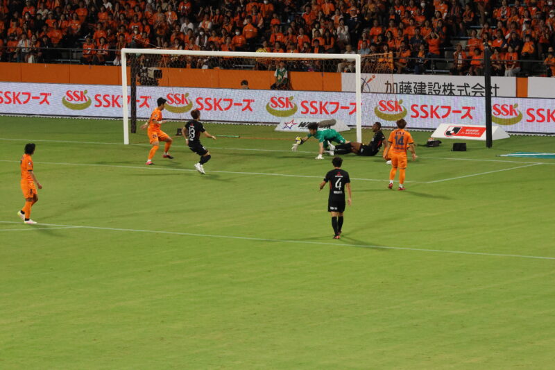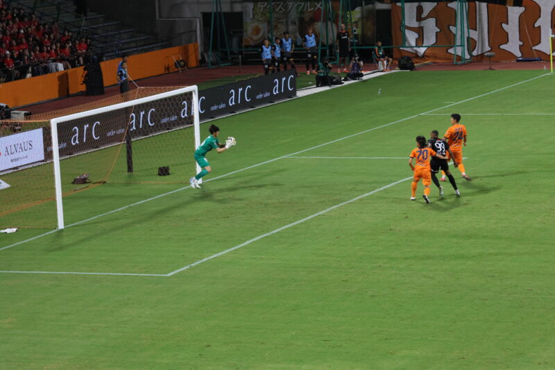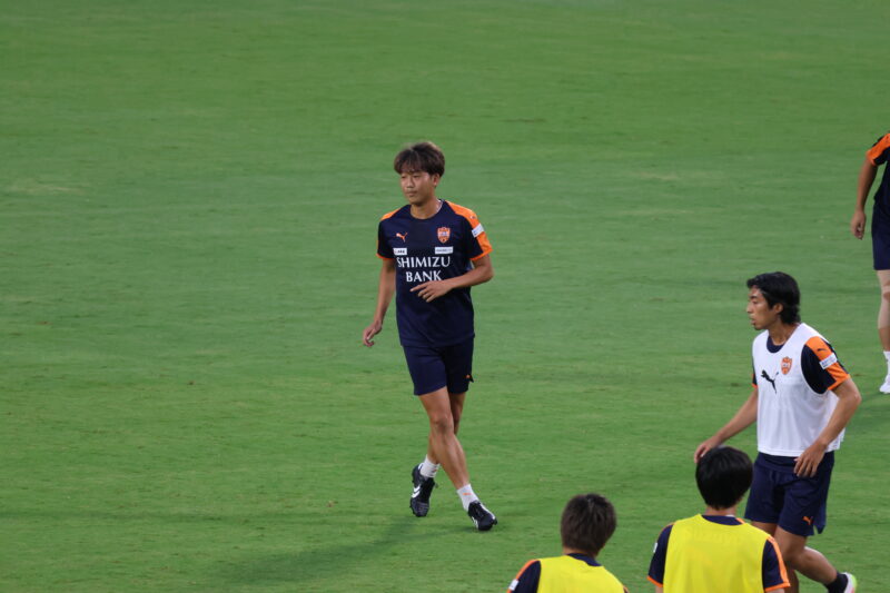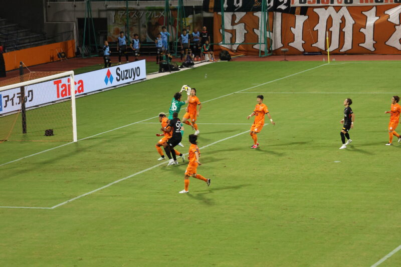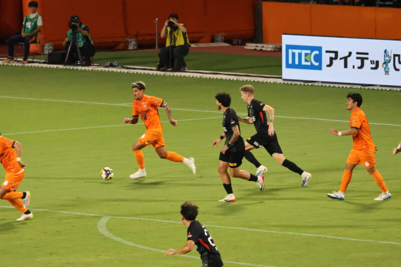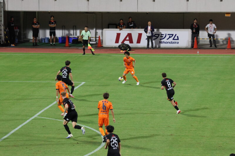 清水は序盤、左サイドからのアタックでCKを獲得したり、右は快速の北爪を活かしながら、裏を狙って攻めていく。