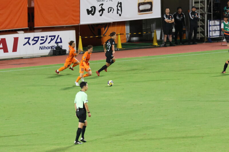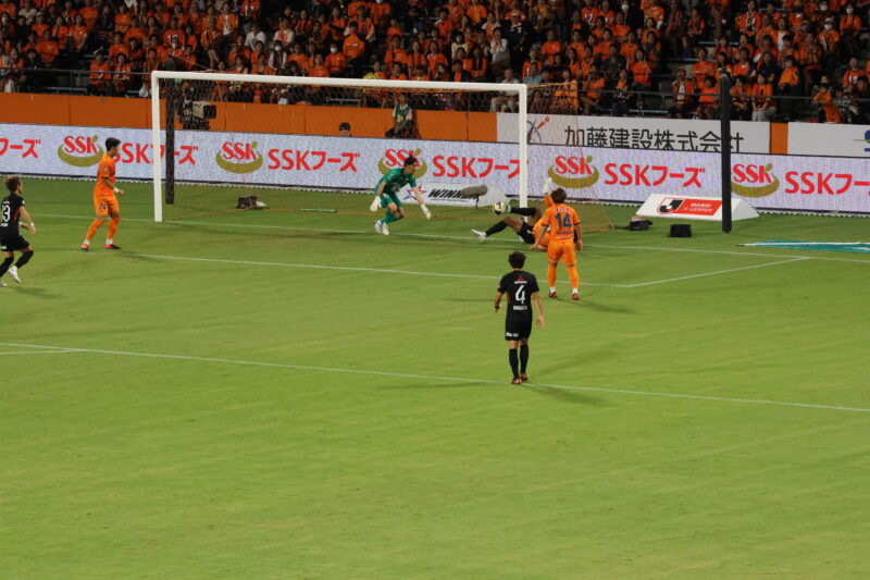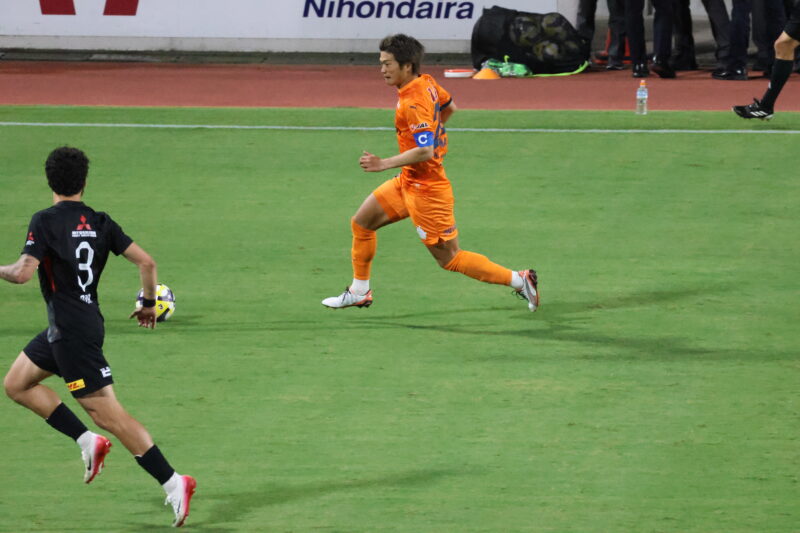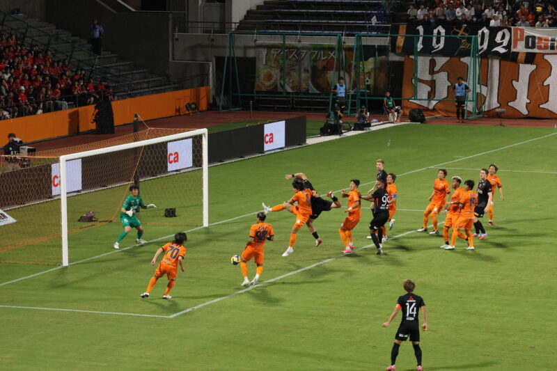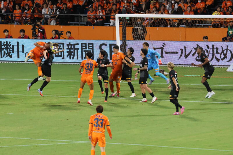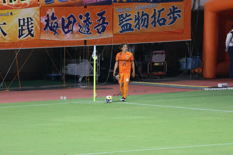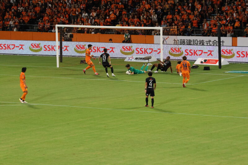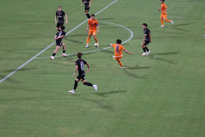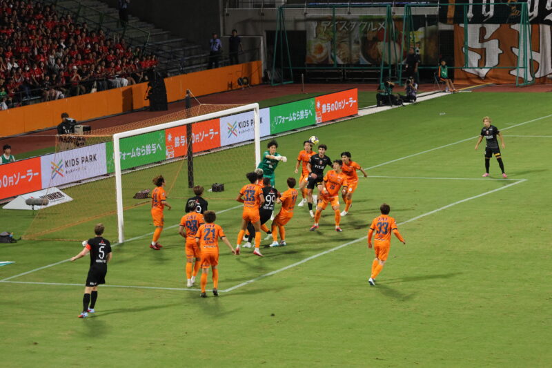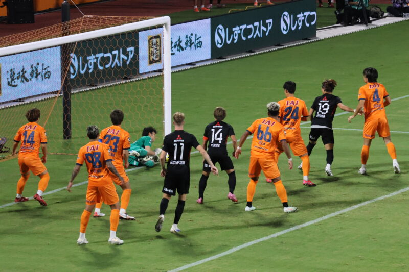 清水は序盤、左サイドからのアタックでCKを獲得したり、右は快速の北爪を活かしながら、裏を狙って攻めていく。