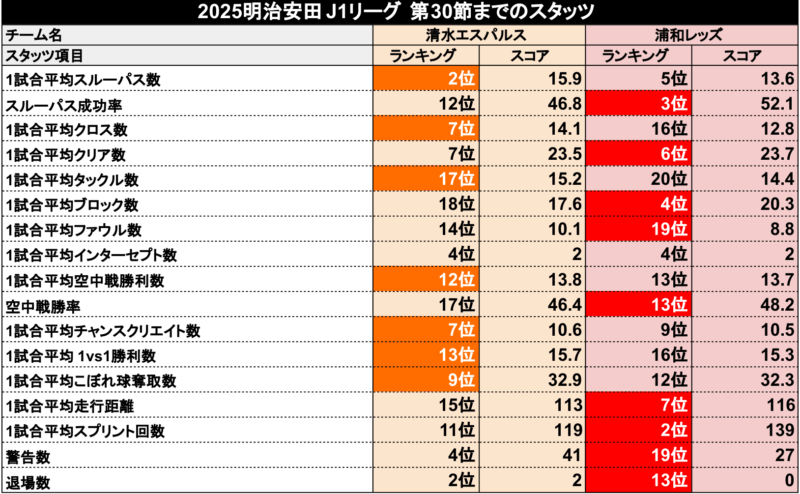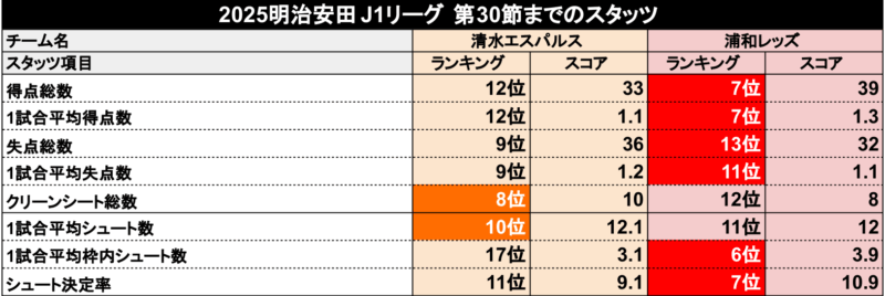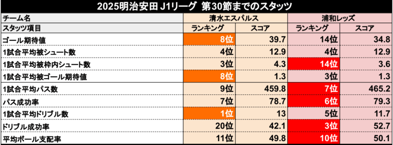 第30節までの両チームスタッツ比較