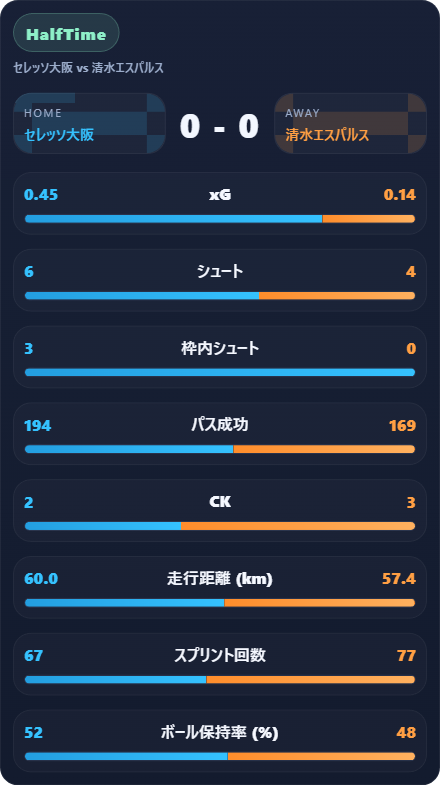 清水は結局枠内シュート0本に終わり、いつもなら高いゴール期待値も0.54止まり。