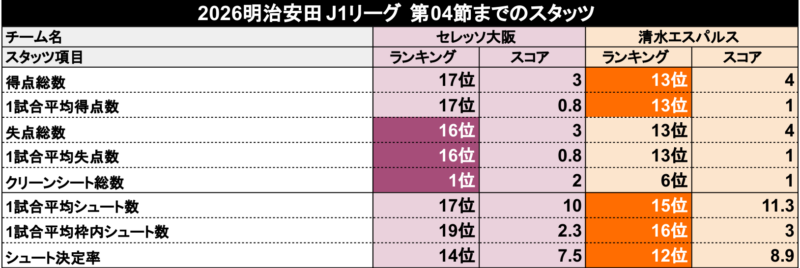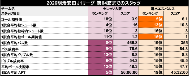 第4節までの両チームスタッツ比較