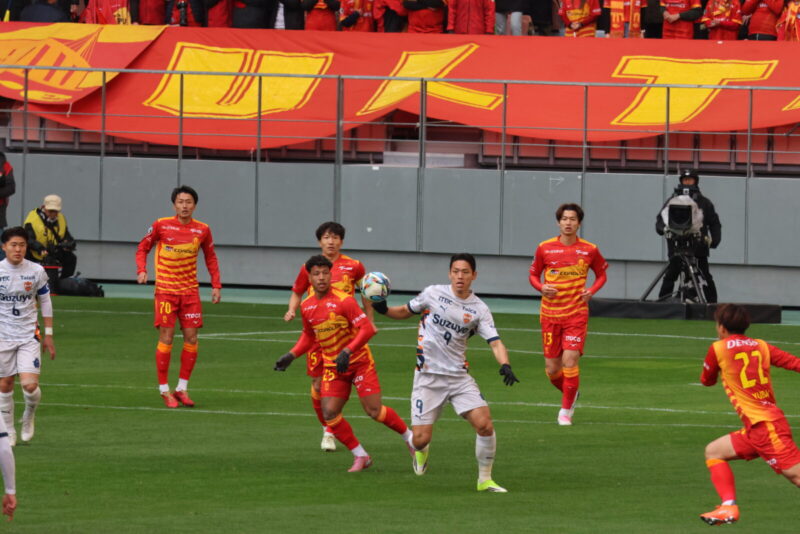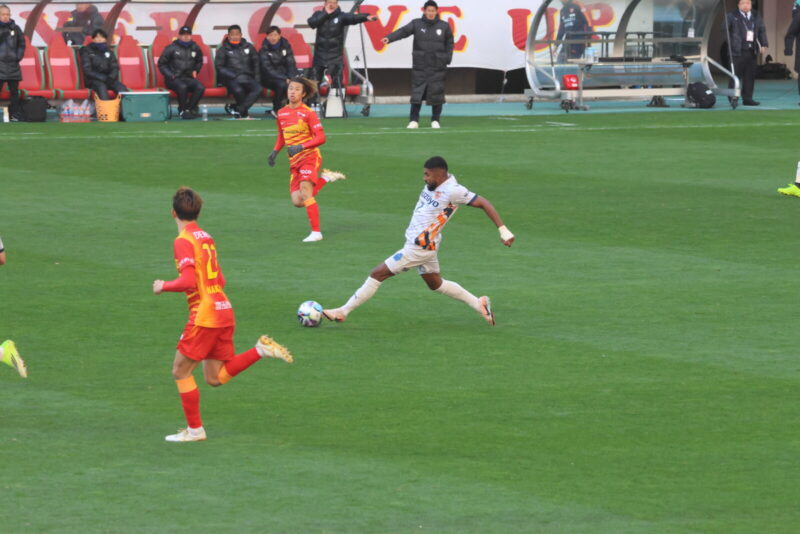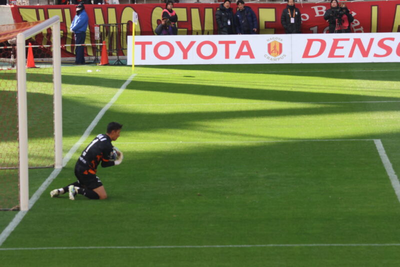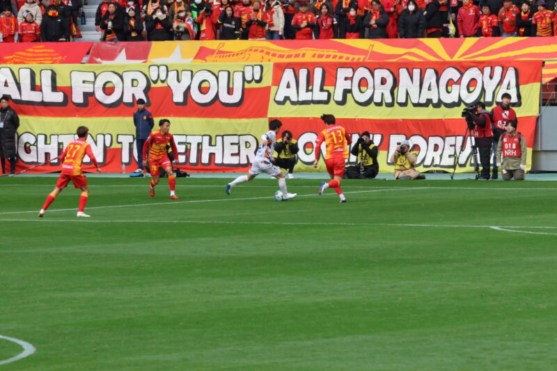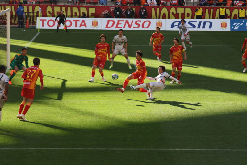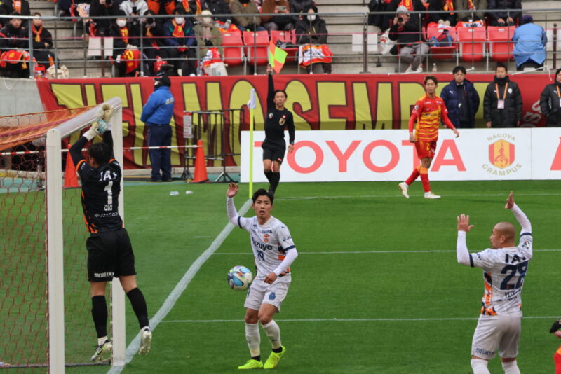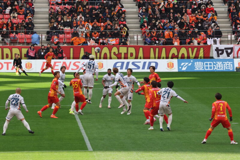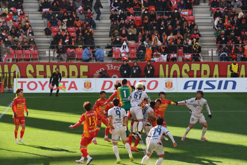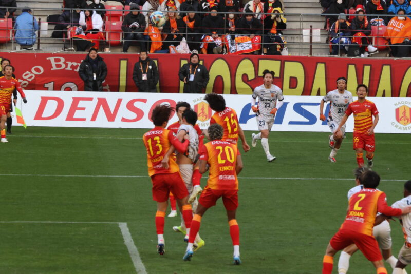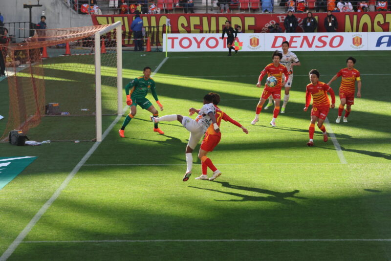 逆に名古屋のヘディングを沖が良く防いだりと、押し込んでいたと思いきや左右に展開されピンチ招く場面も。。